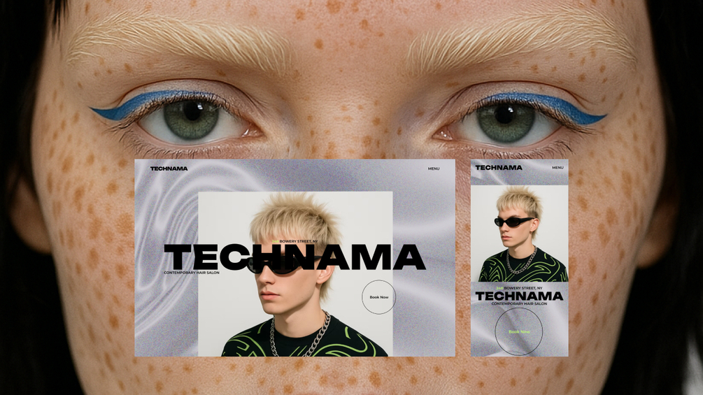 Technama’s layout is defined by clean lines and a monochromatic palette, punctuated by high-contrast visuals. The minimalist structure keeps attention on the salon’s work, while underground design cues add edge and character.