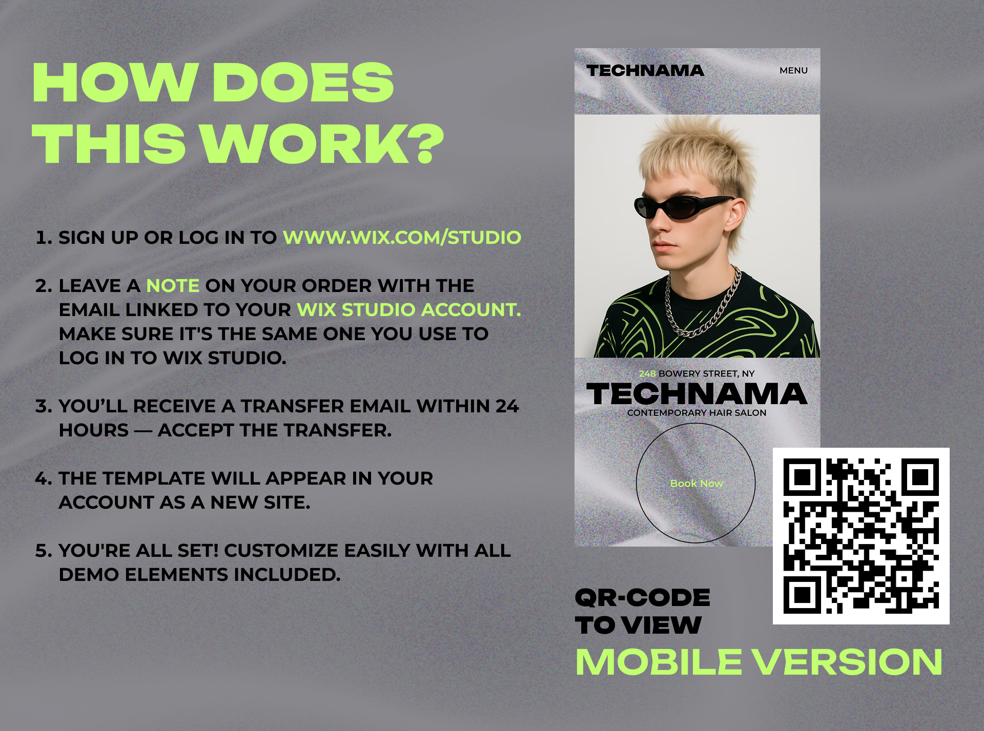 The Technama Hair Salon Template embodies a minimalist, modern, and underground aesthetic. Its design is tailored for salons aiming to project a bold, creative identity while maintaining a sleek online presence.